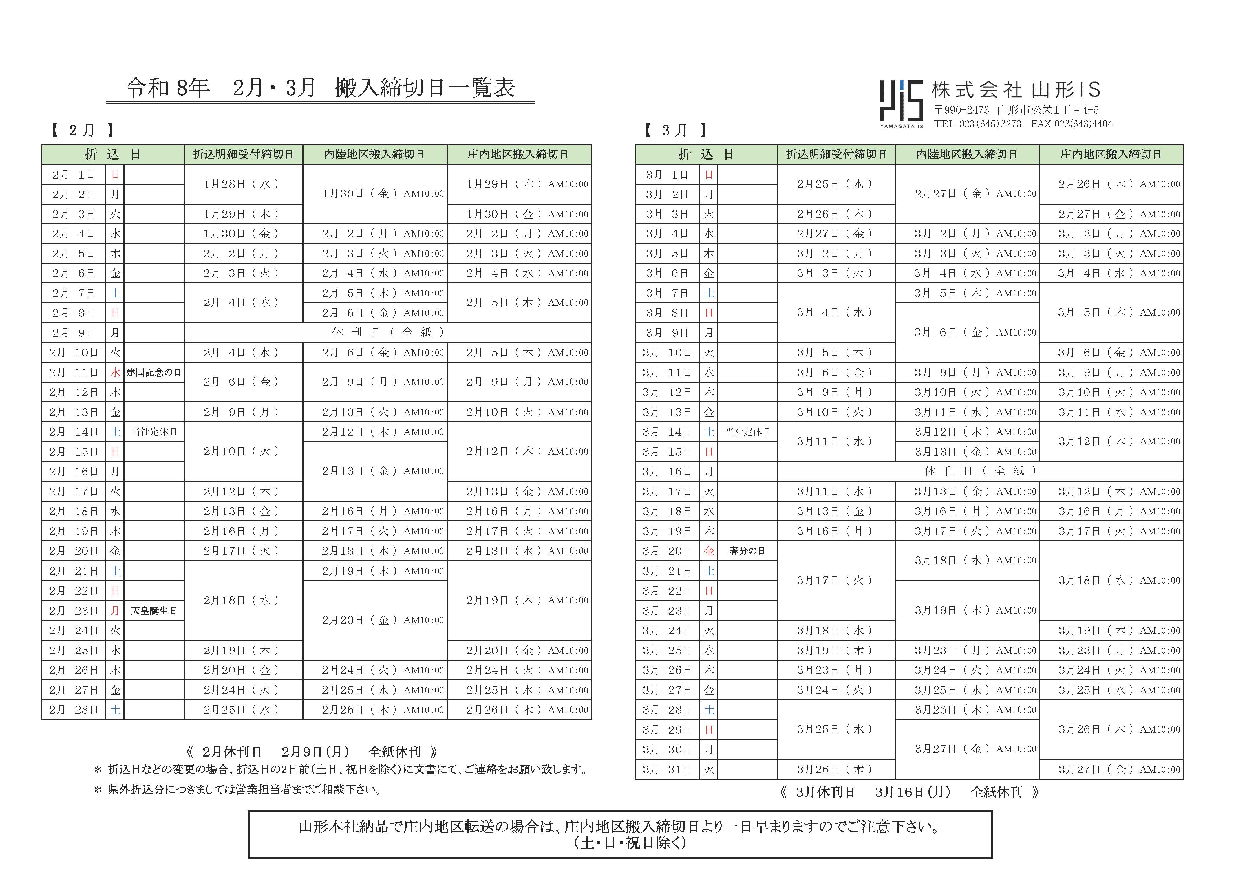 搬入締切カレンダー